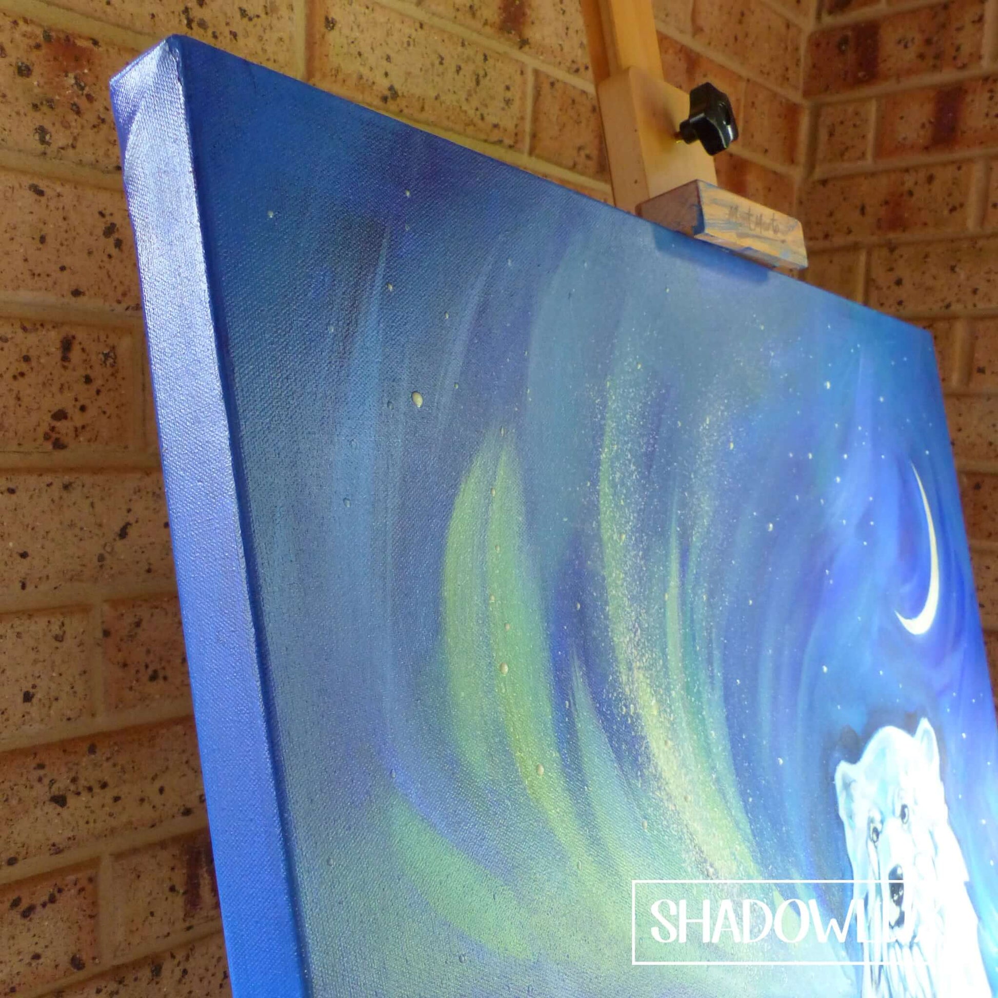A white bear stands beneath a glowing aurora — a snowy scene painted by hand that glows green and blue after dark. Winter colours by day, peaceful glow light by night.