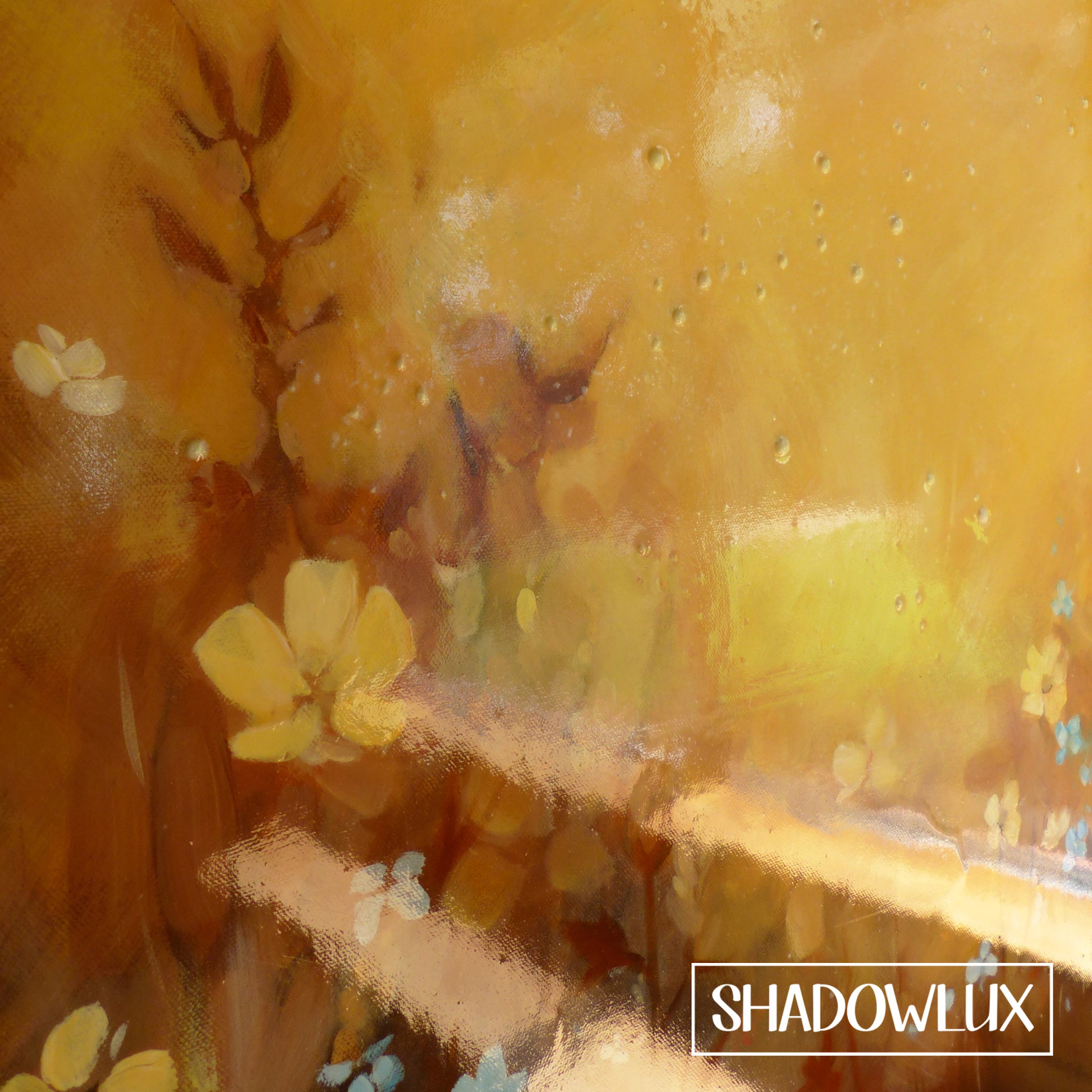 This 76 cm square, 4 cm thick canvas captures a serene yet surreal landscape in golden light. A vast yellow field stretches under a yellow sky. At the bottom of the frame, wildflowers add delicate bursts of detail, swaying in the sunlit expanse. As night falls, the scene transforms—glow in the dark elements awaken, revealing a hidden celestial world.